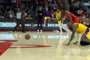 GIF-东契奇被捅了一下丢球 詹姆斯没刹住车 火箭笑纳快攻暴扣