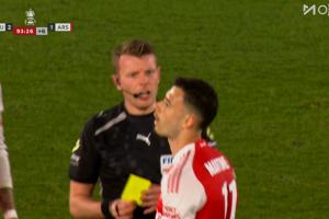 体育资讯04月05日讯 阿森纳vs圣徒第93分钟,道曼推进时倒地,阿森纳定位球,马丁内利着急了随即推了裁判一下,这下马丁内利染黄!
