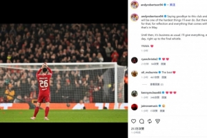 罗伯逊晒出自己向安菲尔德的谢场照,并表示:“告别这家俱乐部和球迷们将是我人生中最艰难的决定之一。但此后将会有那么一个时刻,让我好好回顾并感受一切——那就是五月份。”