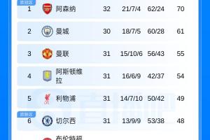 体育资讯04月11日讯 英超第32轮结束一场较量,阿森纳主场1-2负于伯恩茅斯,多赛两场对曼城的领先优势仍为9分,曼城将在明晚23点30客场对阵切尔西;完整英超积分榜如下。