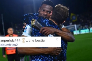 国米官方账号发布了一张邓弗里斯与巴雷拉紧紧相拥的照片,并配文“真美,真美,真的很美”,佩里西奇第一时间做出了回应,与国米球迷共同欢庆。