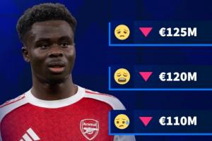 萨卡现年24岁,他本赛季为阿森纳出场38次贡献9球5助,其中26场英超6球3助,表现有所下滑。