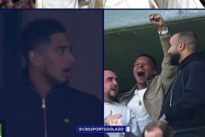 因伤缺席此役的贝林厄姆、姆巴佩在看台观看比赛,巴尔韦德进球之后,贝林厄姆表情惊愕,反应夸张,随后鼓掌庆祝。